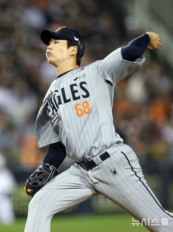 [서울=뉴시스] 고범준 기자 = 8일 서울 송파구 잠실야구장에서 열린 2025 KBO리그 한화 이글스와 두산 베어스의 경기, 5회말 한화 조동욱이 역투하고 있다. 2025.04.08. [email protected]