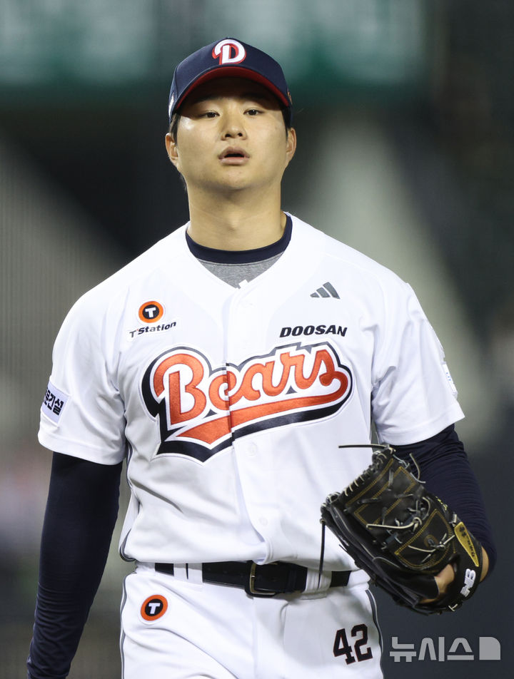 [서울=뉴시스] 고범준 기자 = 8일 서울 송파구 잠실야구장에서 열린 2025 KBO리그 한화 이글스와 두산 베어스의 경기, 연장 11회초를 마친 두산 최지강이 덕아웃을 향햐고 있다. 2025.04.08. [email protected]