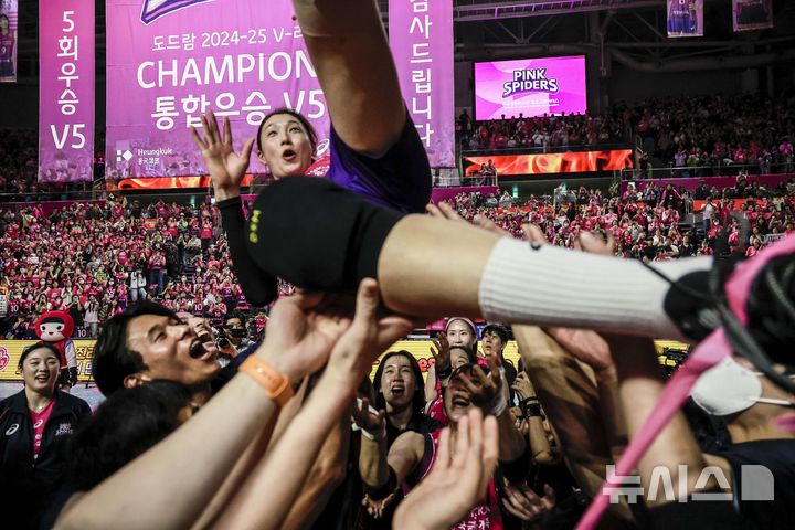 [인천=뉴시스] 정병혁 기자 = 8일 인천 부평구 삼산월드체육관에서 열린 2024-2025 V-리그 여자부 챔피언결정전(5전 3선승제) 5차전 흥국생명 핑크스파이더스와 정관장 레드스파크스의 경기에서 승리해 통합 우승을 차지한 흥국생명 김연경이 동료들로 부터 헹가래를 받고 있다. 2025.04.08. [email protected]