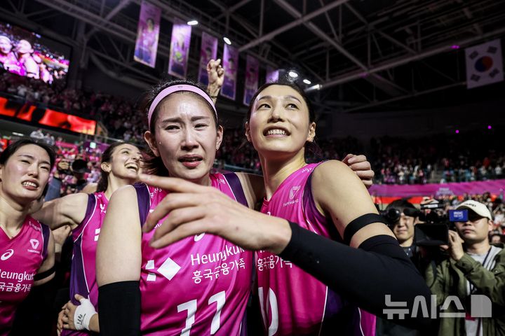 [인천=뉴시스] 정병혁 기자 = 8일 인천 부평구 삼산월드체육관에서 열린 2024-2025 V-리그 여자부 챔피언결정전(5전 3선승제) 5차전 흥국생명 핑크스파이더스와 정관장 레드스파크스의 경기에서 승리해 통합 우승을 차지한 흥국생명 김연경과 김수지가 기뻐하고 있다. 2025.04.08. [email protected]