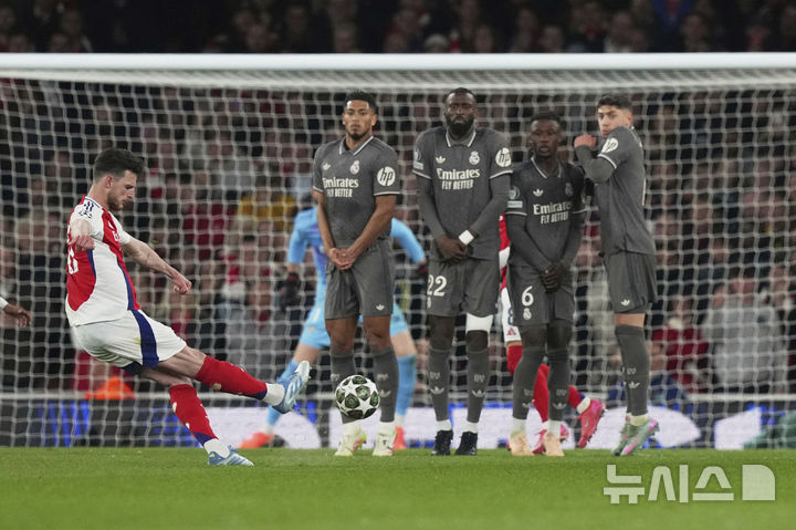[런던=AP/뉴시스] 아스널의 데클란 라이스(왼쪽)가 8일(현지 시간) 영국 런던의 에미레이츠 스타디움에서 열린 2024-25 유럽축구연맹(UEFA) 챔피언스리그(UCL) 8강 1차전 레알 마드리드(스페인)와의 경기 후반 13분 프리킥으로 선제골을 넣고 있다. 라이스는 프리킥으로 멀티 골을 기록했고 아스널은 3-0 완승을 거두며 4강 진출에 유리한 고지를 선점했다. 2025.04.09.
