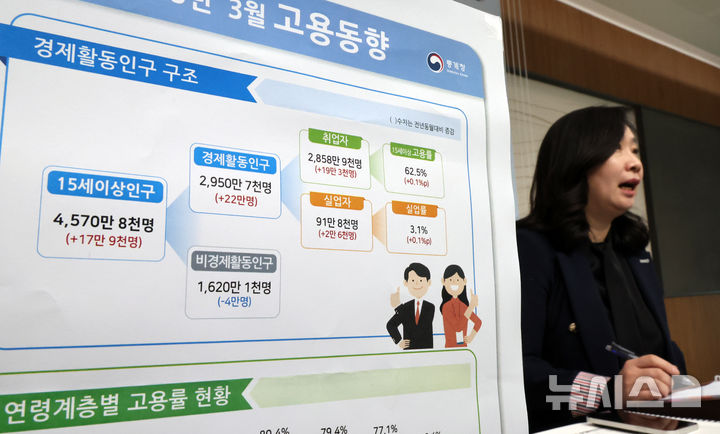 [세종=뉴시스] 강종민 기자 = 공미숙 통계청 사회통계국장이 9일 세종시 정부세종청사에서 2025년 3월 고용동향을 발표하고 있다.