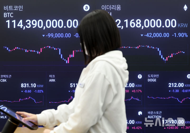 [서울=뉴시스] 이영환 기자 = 도널드 트럼프 미국 대통령발 관세 전쟁에 비트코인 가격이 7만5000달러선까지 하락한 9일 오전 서울 강남구 업비트 고객센터 전광판에 비트코인, 이더리움 시세가 표시되고 있다. 2025.04.09. [email protected]