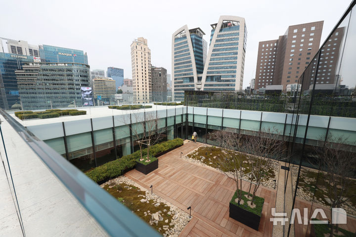 신세계백화점은 90년 된 서울 명동 옛 제일은행 본점 건물의 보존과 복원에 공을 들여 역사·문화·쇼핑이 결합한 공간 '더 헤리티지'를 개관했다. 사진은 이날 서울 중구 신세계백화점 본점 더 헤리티지 옥상정원 모습. 2025.04.09. [email protected]