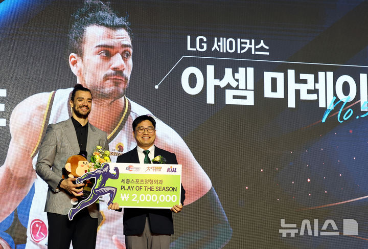 [서울=뉴시스] 박주성 기자 = 9일 서울 삼성동 그랜드 인터컨티넨탈 서울 파르나스 그랜드 볼룸에서 열린 2024~2025시즌 KCC 프로농구 시상식에서 LG 세이커스 아셈 마레이가 세종스포츠정형외과 PLAY OF THE SEASON상을 수상하고 있다. 2025.04.09. [email protected]