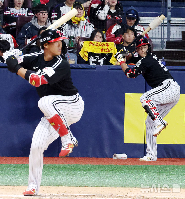 [서울=뉴시스] 추상철 기자 = 9일 오후 서울 구로구 고척스카이돔에서 열린 '2025 KBO리그' LG트윈스와 키움히어로즈의 경기, 5회초 2아웃 주자없는 상황에서 LG 송찬의 타격때 문정빈이 키움 투수 로젠버그의 구질을 살피고 있다. 2025.04.09. [email protected]