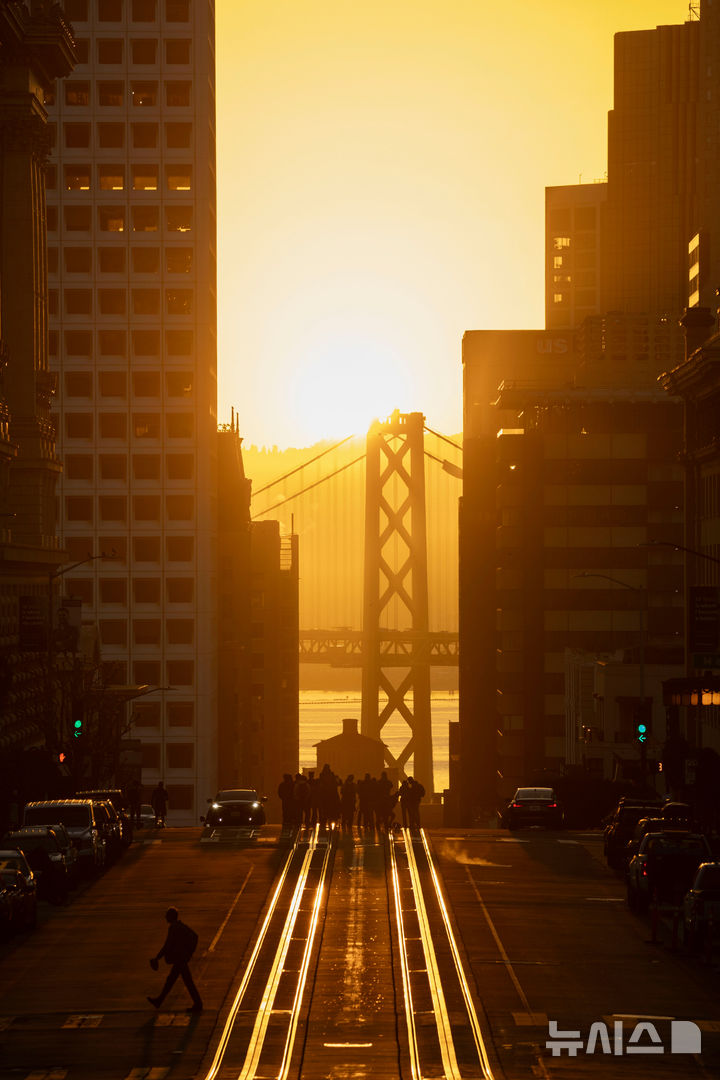 [샌프란시스코=AP/뉴시스] 9일(현지 시간) 미 캘리포니아주 샌프란시스코에서 사람들이 '캘리포니아 헨지'를 구경하고 있다. '캘리포니아 헨지'는 1년에 두 차례, 4월과 9월에 태양이 샌프란시스코 도심 캘리포니아 스트리트를 따라 베이브리지 위로 정렬되며 떠오르는 일출 현상을 일컫는 말이다. 2025.04.10.