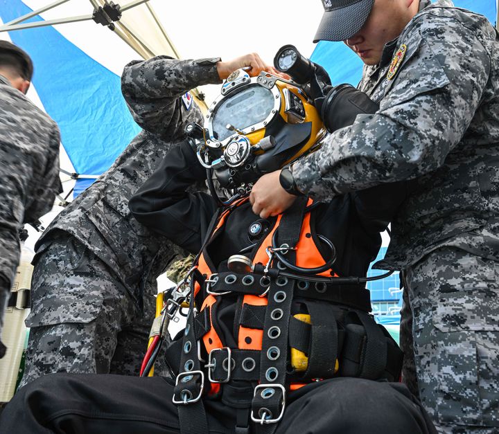 [서울=뉴시스] 8일 경남 창원시 진해만 일대에서 진행된 한·미 해군 연합 구조전 훈련에서 한국 해군 심해잠수사가 표면공급잠수체계(SSDS) 장비를 착용하고 있다. (사진=해군 제공) 2025.04.10. [email protected] *재판매 및 DB 금지