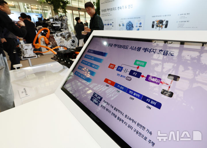 [서울=뉴시스] 이영환 기자 = 지난 10일 오전 서울 중구 크레스트72에서 열린 현대자동차그룹 차세대 하이브리드 시스템 테크 데이에서 차세대 하이브리드 시스템 에너지 흐름도가 전시되어 있다. 2025.04.20. [email protected]