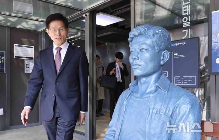 [서울=뉴시스] 김근수 기자 = 김문수 전 고용노동부 장관이 10일 서울 종로구 아름다운 청년 전태일 기념관 앞에서 전태일 동상을 살펴보고 있다. 2025.04.10. [email protected]