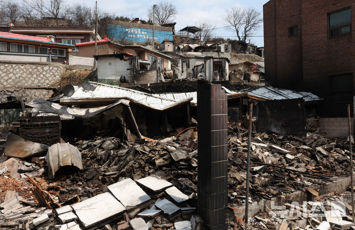 [영덕=뉴시스] 김금보 기자 = 10일 경북 영덕군 영덕읍 노물리 마을 일대 민가와 펜션 건물들이 산불에 파괴돼 있다.