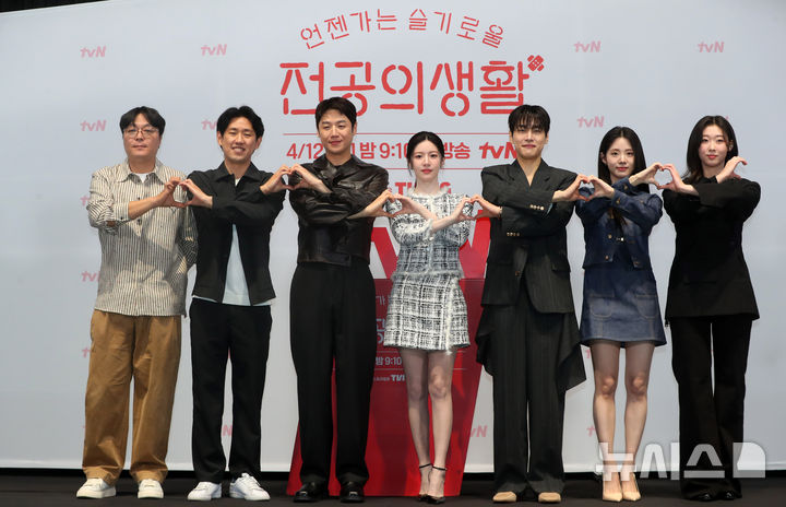 [서울=뉴시스] 김혜진 기자 = 신원호(왼쪽부터) 크리에이터, 이민수 감독, 배우 정준원, 고윤정, 강유석, 신시아, 한예지가 10일 오후 서울 구로구 라마다신도림에서 열린 tvN 새 토일드라마 '언젠가는 슬기로울 전공의생활' 제작발표회에서 포즈를 취하고 있다.