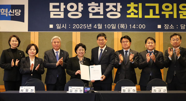 [서울=뉴시스] 고승민 기자 = 김선민(왼쪽 네번째) 조국혁신당 대표 권한대행이 10일 전남 담양리조트에서 열린 조국혁신당 최고위원회에서 정철원 담양군수에게 정책제안서를 전달받고 기념촬영하고 있다. 2025.04.10. [email protected]