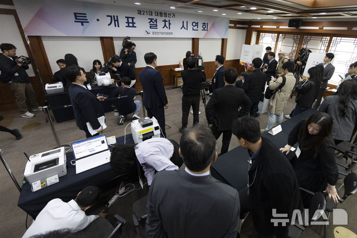 [서울=뉴시스] 정병혁 기자 = 10일 오후 경기도 과천시 중앙선거관리위원회에서 열린 제21대 대통령 선거 투·개표 절차 시연회에서 취재진들이 개표 시연을 취재 하고 있다.(공동취재) 2025.04.10. [email protected]