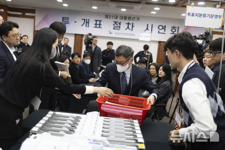 [서울=뉴시스] 정병혁 기자 = 10일 오후 경기도 과천시 중앙선거관리위원회에서 열린 제21대 대통령 선거 투·개표 절차 시연회에서 선관위 직원들이 투표지를 옮기고 있다.(공동취재) 2025.04.10. [email protected]