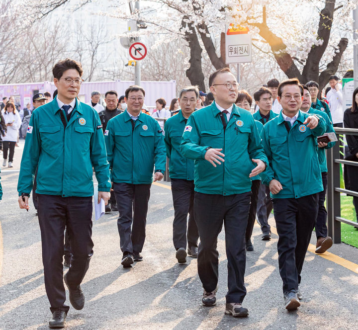 [서울=뉴시스] 추상철 기자 = 이한경 행정안전부 재난안전관리본부장이 10일 서울 여의도 봄꽃축제가 열리는 현장을 방문해 인파관리 및 교통통제 등 안전관리대책 상황을 점검하고 있다. (사진= 행정안전부 제공) 2025.04.10. [email protected] *재판매 및 DB 금지