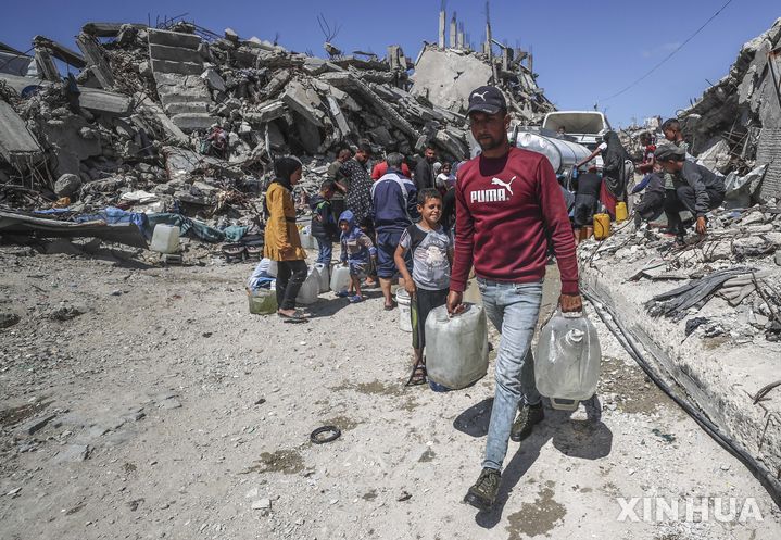 [자발리아=신화/뉴시스] 10일(현지 시간) 가자지구 북부 자발리아 난민캠프에서 팔레스타인 난민들이 급수 트럭에서 물을 받아 돌아가고 있다. 유엔인도주의업무조정국(OCHA)은 가자지구 전역 난민 보호소에서 심각한 식수 부족 현상이 발생하고 있다고 경고했다. 물 부족과 함께 청소용품 부재, 가축과의 공동 거주로 공중보건에 심각한 영향을 미치고 있으며, 지난 3월 한 달간 가자지구 가구 3분의 1 이상이 이에 감염된 것으로 조사됐다고 밝혔다. 2025.04.11.
