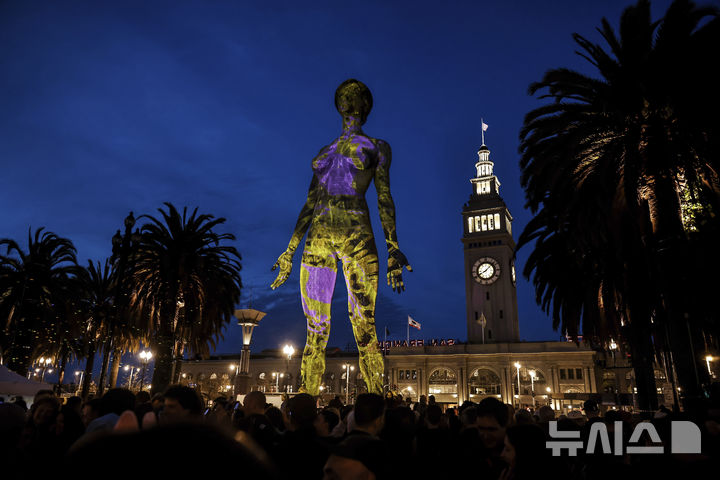 [샌프란시스코=AP/뉴시스] 10일(현지 시간) 미 캘리포니아주 샌프란시스코의 저스틴 허먼 플라자에 설치된 조각가 마코 코크란의 작품 'R-에볼루션'(R-Evolution)이 조명을 받고 있다. 'R-에볼루션'은 높이 약 13.7m의 누드 여성 조각상으로, 여성의 힘과 해방을 상징하며 지난해에는 플로리다주 마이애미 비치에 전시됐었다. 작가는 작품을 통해 여성의 안전과 자유에 대한 메시지를 전달하며 "여성이 진정으로 안전하다면 세상은 어떻게 달라질까?"라는 질문을 던진다. 2025.04.11.