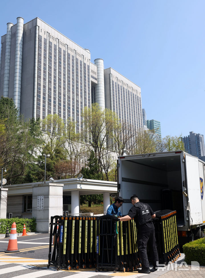 [서울=뉴시스] 홍효식 기자 = 오는 14일 윤석열 전 대통령의 내란 우두머리 혐의 형사재판을 앞두고 법원이 청사 방호 조치 등이 담긴 경비 계획을 발표할 예정인 11일 서울 서초구 서울중앙지방법원 앞에서 경찰이 질서유지선을 옮기고 있다.