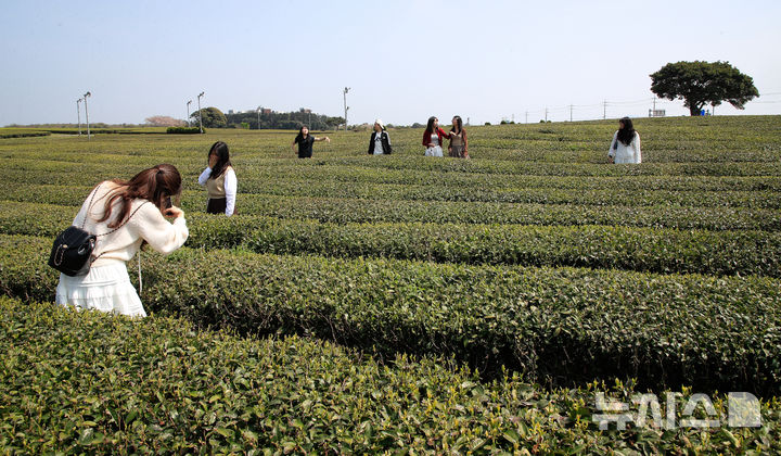 [서귀포=뉴시스] 우장호 기자 = 맑은 날씨를 보인 11일 오후 제주 서귀포시 안덕면 오설록 녹차밭을 찾은 수학여행단 학생들이 서로 사진을 찍어주며 추억을 남기고 있다. 2025.04.11. [email protected]