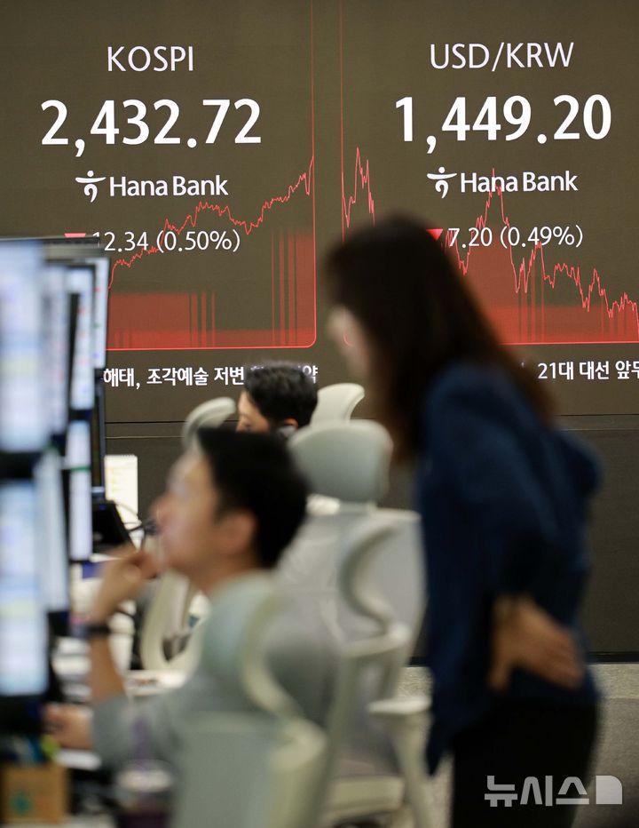 [서울=뉴시스] 고범준 기자 = 코스피가 전 거래일(2445.06)보다 12.34포인트(0.50%) 하락한 2432.72에 장을 마감한 11일 오후 서울 중구 하나은행 딜링룸 전광판에 지수가 표시되고 있다.