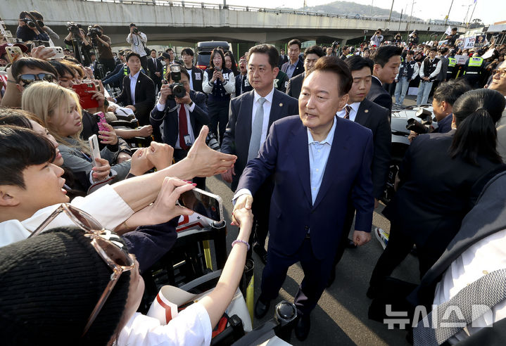 [서울=뉴시스] 황준선 기자 = 윤석열 전 대통령이 11일 오후 서울 용산구 한남동 대통령 관저를 떠나며 지지자들과 인사를 나누고 있다. (공동취재) 2025.04.11. [email protected]
