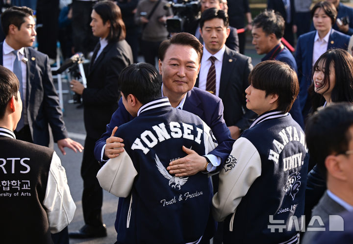 [서울=뉴시스] 황준선 기자 = 윤석열 전 대통령이 11일 서울 용산구 한남동 대통령 관저를 떠나 서초동 사저로 이동하며 지지자들과 포옹을 하고 있다. (공동취재) 2025.04.11. [email protected]