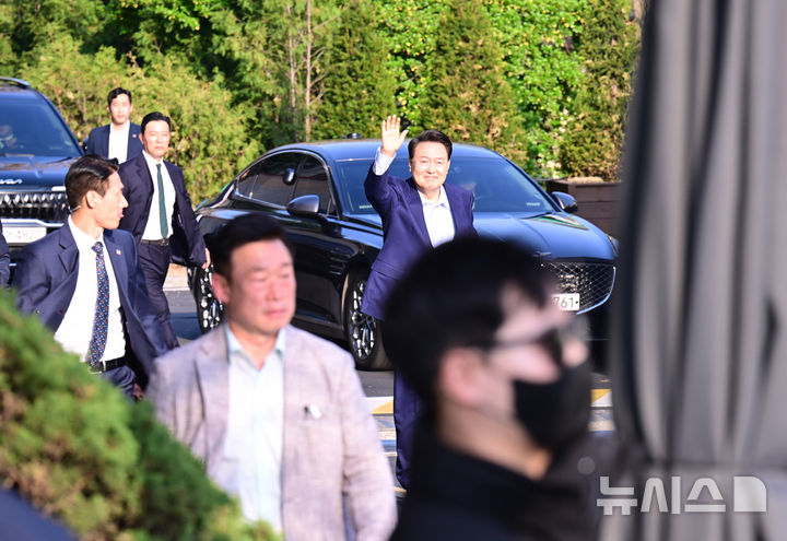[서울=뉴시스] 황준선 기자 = 윤석열 전 대통령이 11일 서울 용산구 한남동 대통령 관저를 떠나 서초동 사저로 이동하며 지지자들과 인사를 나누고 있다. (공동취재) 2025.04.11. [email protected]