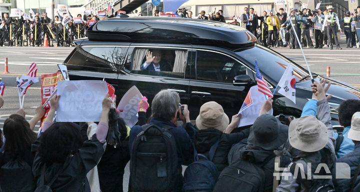 [서울=뉴시스] 황준선 기자 = 윤석열 전 대통령이 11일 오후 서울 용산구 한남동 대통령 관저를 떠나며 지지자들에게 인사하고 있다. (공동취재) 2025.04.11. [email protected]