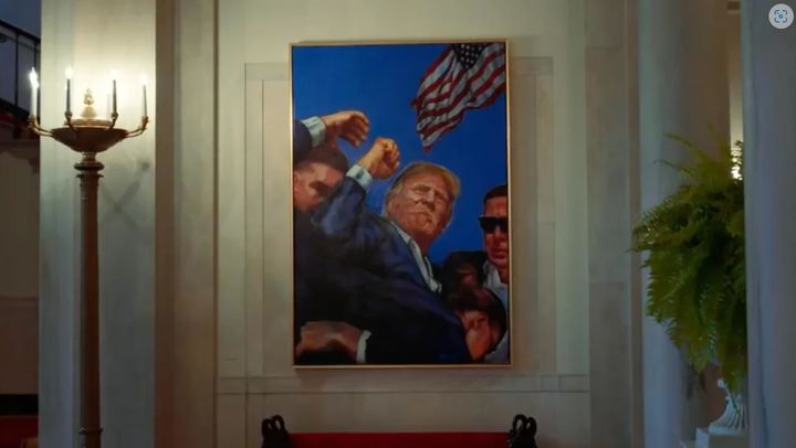 [서울=뉴시스]미 백악관은 11일 버락 오바마 전 대통령의 공식 초상화를 떼어내고 대신 지난해 여름 암살 시도 직후 주먹을 치켜든 모습을 그린 도널드 트럼프 대통령의 그림을 걸었다. 사진은 오바마 대통령의 초상화를 밀어내고 새로 걸린 트럼프의 암살 시도 직후 모습 그림이 걸린 백악관 내부 모습. <사진 출처 : CNN> 2025.04.12.