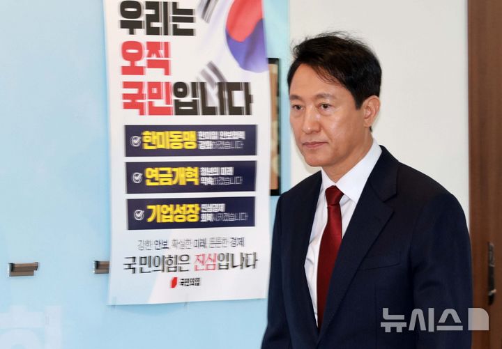 [서울=뉴시스] 고범준 기자 = 오세훈 서울시장이 12일 서울 영등포구 국민의힘 중앙당사에서 제21대 대통령 선거 관련 긴급 기자회견을 위해 들어서고 있다.