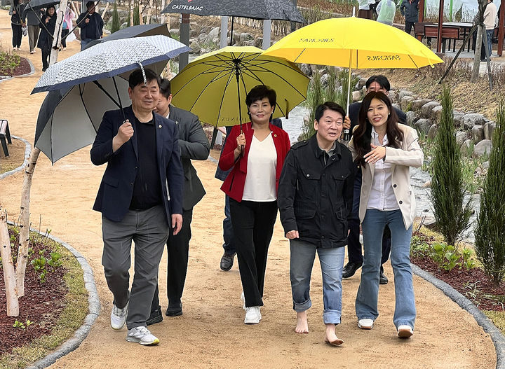 [서울=뉴시스] 조성우 기자 = 제21대 대통령 선거 출마를 선언한 안철수 국민의힘 의원이 12일 경기도 성남시 분당구 대장근린공원에서 열린 '맨발 흙길 개장식'에 참석해 주민들과 흙길을 걷고 있다. (사진=안철수 캠프 제공) 2025.04.12. [email protected] *재판매 및 DB 금지