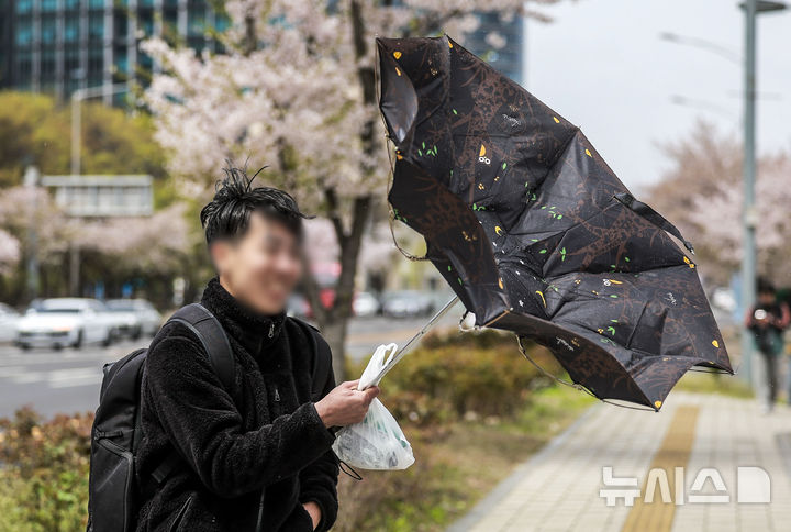 [서울=뉴시스] 정병혁 기자 = 서울 시내에 강풍을 동반한 우박이 내린 13일 서울 영등포구 여의서로에서 시민들이 쓴 우산이 강풍에 뒤집히고 있다. 2025.04.13. [email protected]