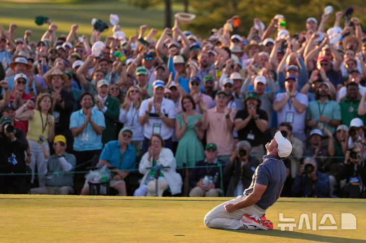 [오거스타=AP/뉴시스] 로리 매킬로이(북아일랜드)가 13일(현지 시간) 미 조지아주 오거스타 내셔널 골프클럽에서 열린 제89회 마스터스 토너먼트 최종 라운드 연장전에서 승리한 후 포효하고 있다. 매킬로이는 최종 합계 11언더파 277타로 저스틴 로즈(영국)와 동타를 이뤄 연장 끝에 정상에 올라 커리어 '그랜드 슬램'을 달성했다. 2025.04.14.