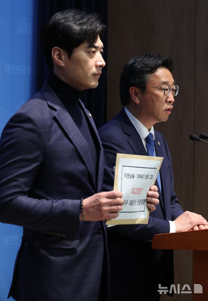 [서울=뉴시스] 조성봉 기자= 이용우 더불어민주당 법률위원장이 14일 오후 서울 여의도 국회 소통관에서 열린 '한덕수 대통령 권한대행 직권남용, 직무유기 혐의 고발' 기자회견에서 발언을 하고 있다. 왼쪽은 한준호 최고위원. 2025.04.14. [email protected]