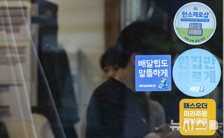 [서울=뉴시스] 김근수 기자 = 14일 서울 시내의 한 음식점 앞 배달의민족 스티커가 붙어 있다. 배달 플랫폼 배달의민족은 14일부터 포장 주문에도 수수료 6.8%를 부과하기 시작했다. 2025.04.14. [email protected]