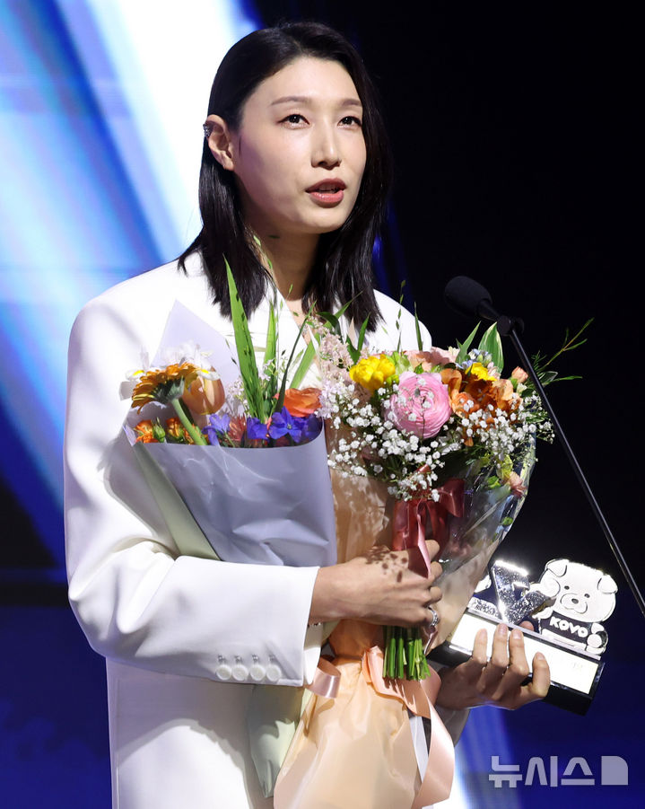 [서울=뉴시스] 추상철 기자 = 14일 오후 서울 서대문구 스위스 그랜드 호텔에서 열린 '2024-2025 V리그 시상식', 여자부 20주년 BEST7에 선정된 아웃사이드 히터 김연경이 소감을 밝히고 있다. 2025.04.14. [email protected]