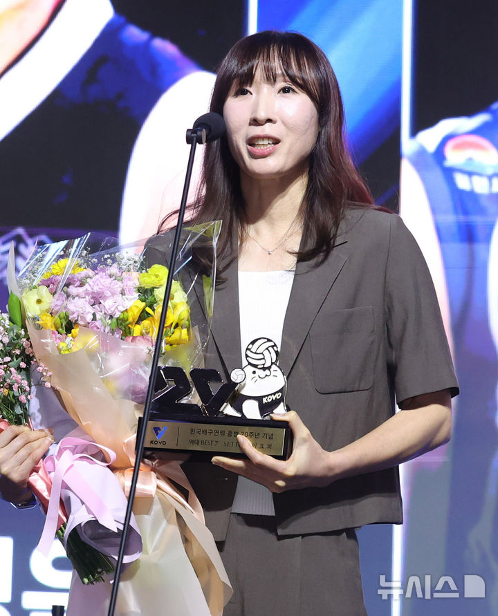 [서울=뉴시스] 추상철 기자 = 14일 오후 서울 서대문구 스위스 그랜드 호텔에서 열린 '2024-2025 V리그 시상식', 여자부 20주년 BEST7에 선정된 세터 이효희가 소감을 밝히고 있다. 2025.04.14. [email protected]