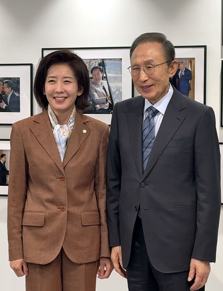[서울=뉴시스] 조성봉 기자 = 대선 출마를 선언한 나경원 국민의힘 의원이 14일 오후 서울 서초구 이명박 재단을 찾아 이명박 전 대통령을 예방하며 기념촬영을 하고 있다.(사진=나경원 캠프 제공) 2025.04.14. [email protected] *재판매 및 DB 금지
