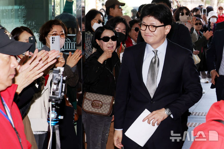 [서울=뉴시스] 조성봉 기자 = 대선 출마를 선언한 한동훈 전 국민의힘 대표가 15일 서울 여의도 국회 소통관에서 정책 비전 발표를 하기 위해 입장하며 지지자들에게 박수를 받고 있다. 2025.04.15. [email protected]