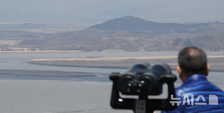 [파주=뉴시스] 김금보 기자 = 김일성 북한 주석 생일(태양절)인 15일 경기 파주시 오두산통일전망대에서 관광객이 북한 개풍군 마을을 살펴보고 있다. 2025.04.15. [email protected]