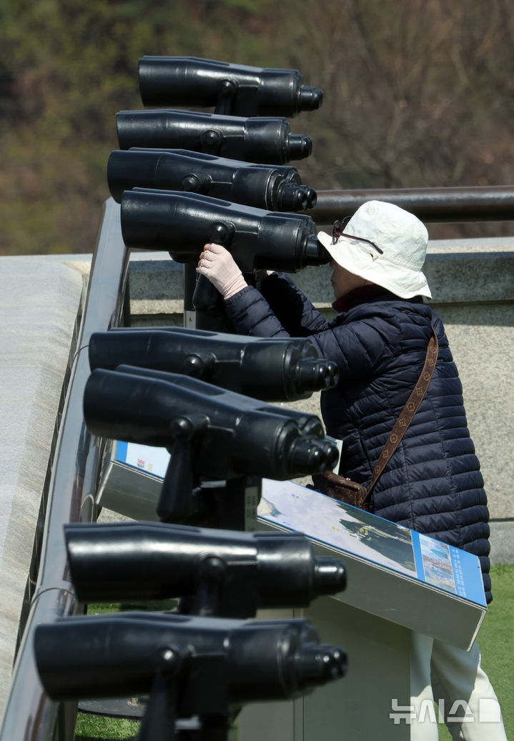 [파주=뉴시스] 김금보 기자 = 김일성 북한 주석 생일(태양절)인 15일 경기 파주시 오두산통일전망대에서 관광객이 북한 개풍군 마을을 살펴보고 있다. 2025.04.15. [email protected]