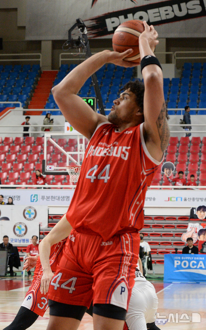 [울산=뉴시스] 배병수 기자 = 15일 울산 중구 동천체육관에서 열린 프로농구 2024~2025 KBL리그 플레이오프 6강 경기 울산 현대모비스와 안양 정관장의 경기, 모비스 게이지 프림이 슛하고 있다. 2025.04.15. [email protected]