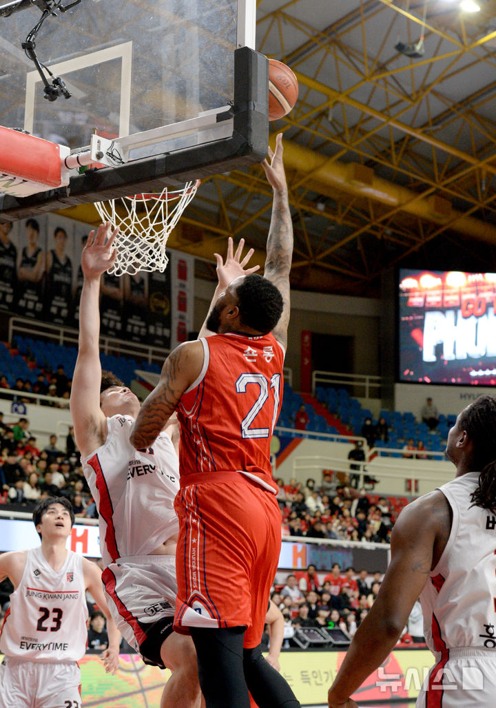 [울산=뉴시스] 배병수 기자 = 15일 울산 중구 동천체육관에서 열린 프로농구 2024~2025 KBL리그 플레이오프 6강 경기 울산 현대모비스와 안양 정관장의 경기, 모비스의 숀 롱이 슛하고 있다. 2025.04.15. [email protected]