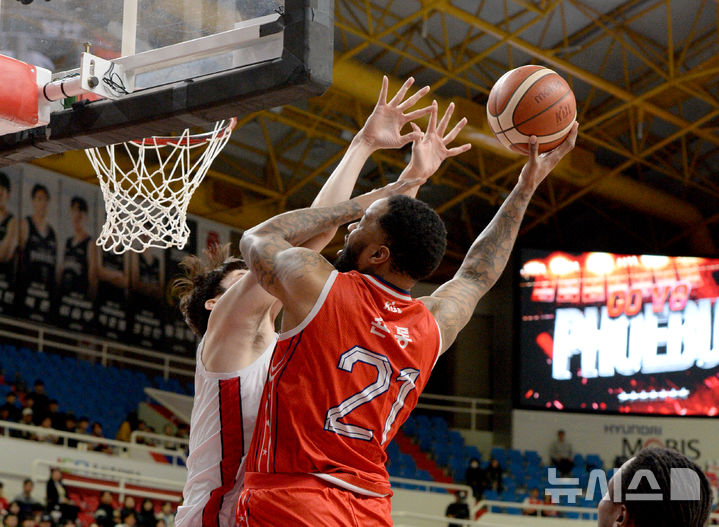 [울산=뉴시스] 배병수 기자 = 15일 울산 중구 동천체육관에서 열린 프로농구 2024~2025 KBL리그 플레이오프 6강 경기 울산 현대모비스와 안양 정관장의 경기, 모비스의 숀 롱이 슛하고 있다. 2025.04.15. [email protected]