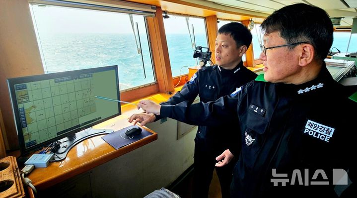 [인천=뉴시스] 16일 오전 인천 옹진군 백령도 인근 해상 1507함에서 김용진 해양경찰청장이 중국어선 분포현황을 보고받고 있다. 이날 김 청장은 불법조업 행위에 대해 무관용 원칙으로 단호히 대응해 국민이 안심하고 생업에 전념할 수 있도록 최선을 다해달라고 당부했다. (사진=해양경찰청 제공) 2025.04.16. [email protected]