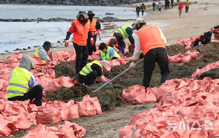 [제주=뉴시스] 우장호 기자 = 강한 바람이 부는 16일 오전 제주시 이호테우해수욕장에서 '제주시 바다환경지킴이' 회원들이 밤사이 해변으로 떠밀려온 미역을 수거하고 있다. 2025.04.16. [email protected]