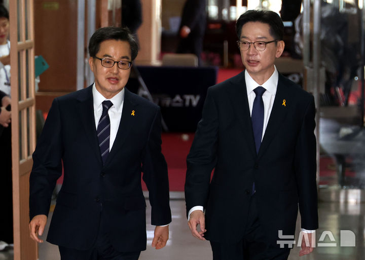 [서울=뉴시스] 조성봉 기자 = 김경수, 김동연(왼쪽) 제21대 대통령 선거 더불어민주당 경선 후보가 16일 오전 서울 여의도 국회에서 열린 공명선거 실천 서약식에 참석하고 있다. 2025.04.16. [email protected]