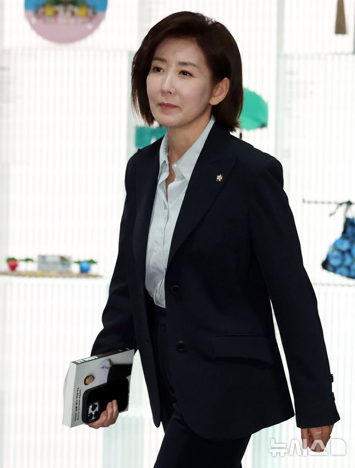 [서울=뉴시스] 추상철 기자 = 대선 출마를 선언한 나경원 국민의힘 의원이 16일 오전 서울 중구 서울시청에서 오세훈 서울시장을 만나기 위해 이동하고 있다. 2025.04.16. [email protected]