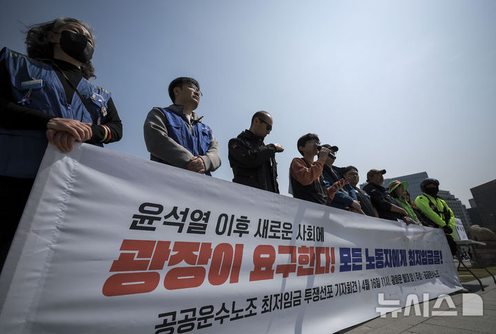 [서울=뉴시스] 정병혁 기자 =14일 서울 종로구 광화문 월대에서 열린 공공운수노조 조합원들이 최저임금 투쟁 선포 기자회견을 하고 있다.  2025.04.16. [email protected]
